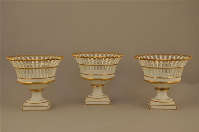 PARIS. Suite de TROIS CORBEILLES circulaires évasées en porcelaine ajourée. Base quadrangulaire. Filets or. XIXème.
