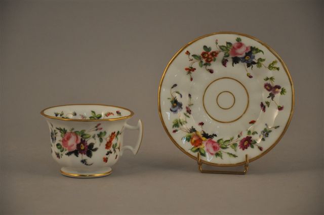 PARIS. TASSE et sa sous tasse en porcelaine polychrome, à côtes, à décor peint de fleurs, filets dorés. Restauration, XIXème . Diam sous tasse : 14, Haut. de la tasse : 6,5 cm