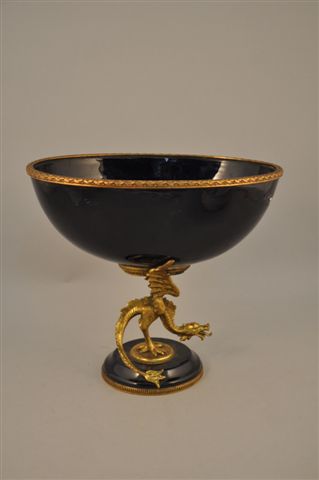 VARIA. COUPE en porcelaine bleu de four, la base circulaire, le piètement composé d'un dragon aux ailes déployées en bronze doré, soutenant un réceptacle ovale, cerclée de bronze. Haut. 28,5, Long. 31,5, Prof. 22 cm.