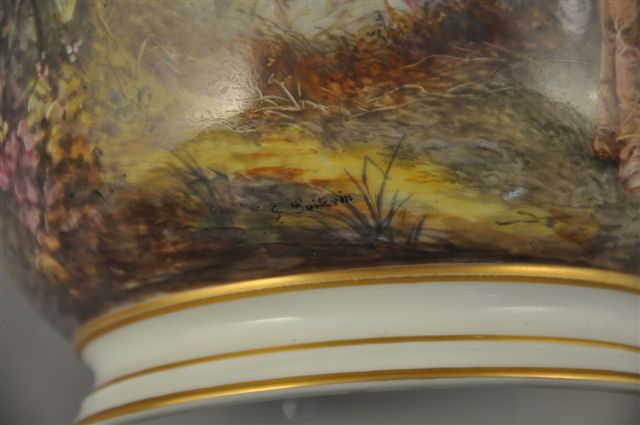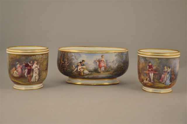 VARIA. GARNITURE de CHEMINÉE en porcelaine émaillée polychrome comprenant une JARDINIÈRE et une PAIRE DE CACHE-POTS. Décor de paysages et de scènes galantes inspirées de la Renaissance et du Siècle des Lumières. Signée G. POITEVIN. XIXème.