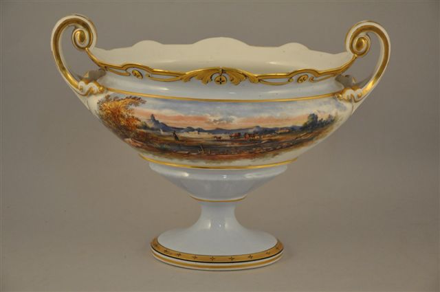 VARIA. JARDINIERE ovale sur pied en porcelaine. Décor peint de paysages lacustres animés de personnages (Suisse ou Italie ?), en bandeau, sur fond bleu ciel. Bordure feuillagée or et filets or. Haut. 29, Long. 39,5, Larg. 25,5 cm.