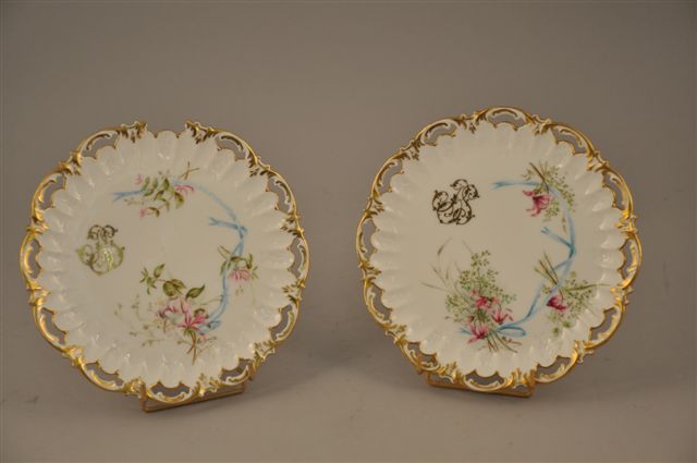 VARIA. LOT comprenant une PAIRE d'ASSIETTES ajourées, en porcelaine à décor peint de cyclamens et de chèvrefeuille, signée M. BANCE (accident à l'une). Début XXème. Diam. 24 cm. PAIRE de PLATS en porcelaine anglaise, or et bordeaux, au revers la devise royale. Diam. 24,5 cm.