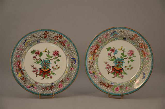 ANGLETERRE. PAIRE d'ASSIETTES en porcelaine à décor de vases fleuris, dans le goût de MINTON, inspiré de la Chine. Diam. 25 cm.