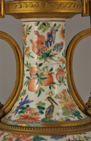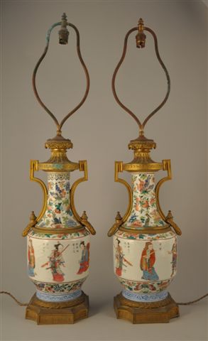 Montés en lampes dites "Carcel", plaque de la Maison "GAGNEAU, rue d'Enghien, 25, Paris", puis électrifiés. Haut. Hors tout : 82 cm. (vases en deux parties, scission à l'épaulement).