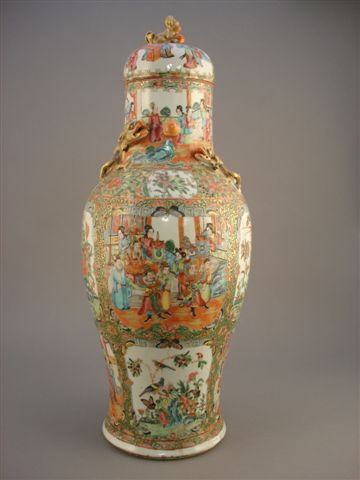 CANTON. VASE couvert en porcelaine blanche décorée en émaux polychromes et émail or de médaillons de personnages, oiseaux et fleurs. XIXème. Haut. 65 cm.