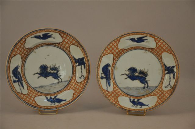CHINE. COMPAGNIE des INDES. PAIRE d'ASSIETTES en porcelaine à décor dans le bassin d'un chien et sur l'aile, dans des réserves, de volatiles, sur fond quadrillé. XVIIIème. Diam. 23 cm. (fêle à une assiette)