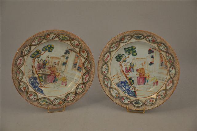 CHINE. COMPAGNIE des INDES. PAIRE d'ASSIETTES creuses en porcelaine à décor, dans le bassin d'une scène familiale et sur l'aile d'entrelacs encadrant des fleurs et des papillons. XVIIIème. Diam. 23 cm. (quelques petites égrenures).