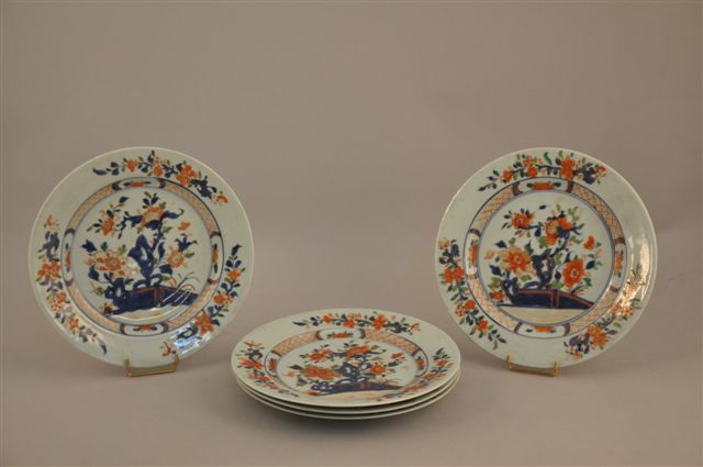 CHINE. COMPAGNIE des INDES. Suite de CINQ ASSIETTES en porcelaine à décor floral. XVIIIème. Diam 22,5 cm. (quelques égrenures)
