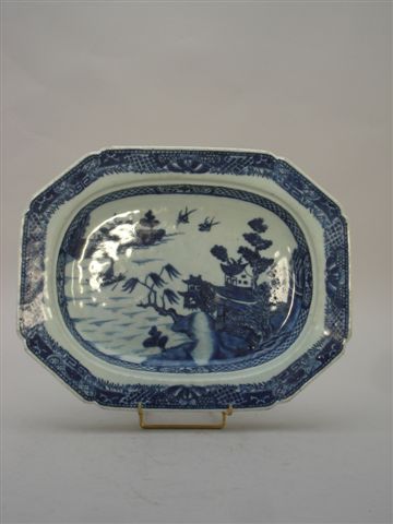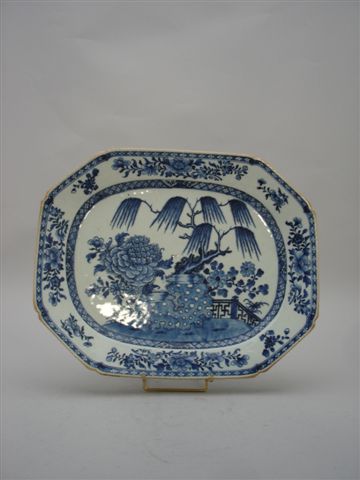 CHINE. DEUX PLATS rectangulaires à pans coupés en porcelaine de Chine bleu et blanc à décor de pivoines, pagodes et rameaux fleuris. XIXème.