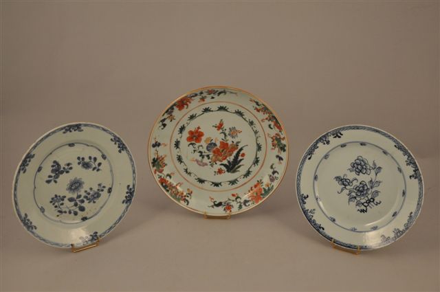 Deux ASSIETTES en porcelaine à décor en bleu floral. XIXème. Diam. 23,5 cm.(fêles et éclats).