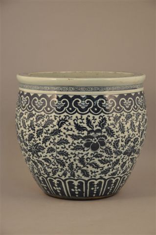 CHINE. POT en porcelaine à corps renflé à décor floral et végétal en bleu . Haut. 34, Diam. au col. 36 cm (accident dans le fond)