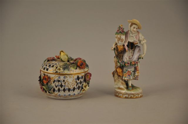 Joint : STATUETTE en porcelaine polychrome représentant une élégante au chapeau portant une guirlande de fleurs, dans le goût de Saxe. Haut. 15 cm. (petits accidents et restaurations).