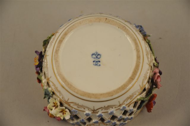 LUDWIGSBURG. POT-POURRI ajouré de résille en porcelaine à décor en ronde-bosse de fleurs polychromes appliquées. Marque : double C couronné. XIXème. Haut. 6,5 cm.