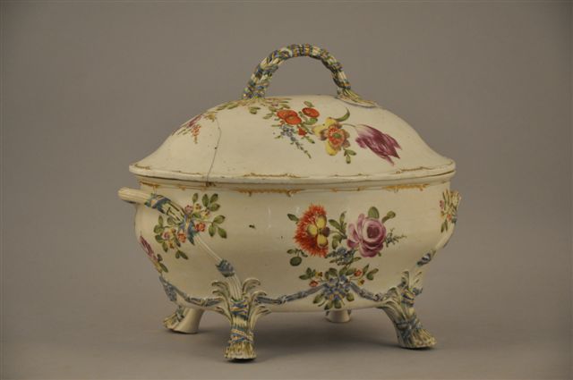 LUDWIGSBURG. SOUPIERE ovale en porcelaine polychrome. Elle repose sur quatre pieds feuillagé dont le motif se prolonge par les deux anses latérales. Décor polychrome peint de fleurs au naturel : tulipes, roses, myosotis... agrémenté de rubans noués, rehauts d'or. Marque double "C" couronné. XVIIIème. (éclats, fêles).
