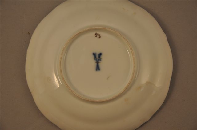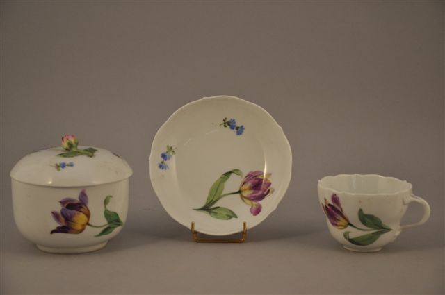 MEISSEN. Ensemble de 3 pièces en porcelaine comprenant une TASSE, une SOUS-TASSE, et un SUCRIER à décor peint de tulipes et de fleurs bleues. Prise du couvercle en bouton de rose. Marquées. XIXème. Haut. du sucrier : 10 cm.