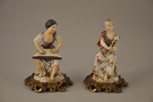 SAXE. LES MUSICIENNES. PAIRE de FIGURINES en porcelaine polychrome montées sur un socle en bronze doré de style rocaille. Porte la marque de Saxe et le monogramme AB. Dans le goût des productions de Meissen du XVIIIème siècle.