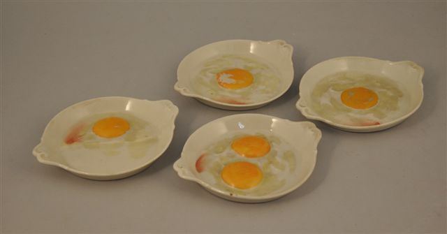 VARIA. Ensemble de quatre ÉCUELLES en grès porcelaineux "Oeuf au plat" en trompe l'oeil polychrome, dont un double. Cachet en bleu au revers "Faiencerie de Morey" et "Grès d'Epinouze", G.D. Paris. Long. 17 cm.