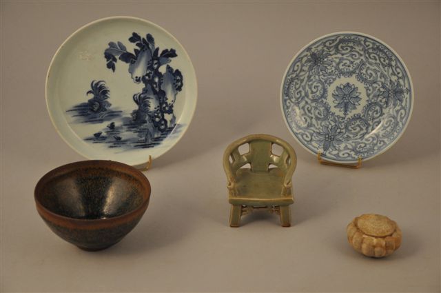 VARIA. LOT de BIBELOTS comprenant deux soucoupes en porcelaine bleu et blanc, une boîte à pommade en grès à décor godronné, un bol en grès sous couverte glaçurée brune, un fauteuil de mandarin en céramique verte.