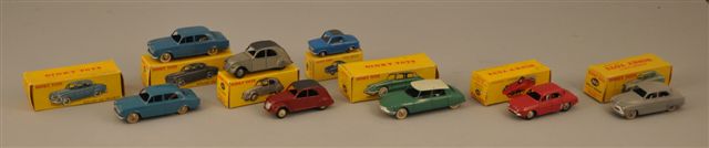 DINKY TOYS France. 1/43ème. LOT 8 unités comprenant : une voiture 2 cv Vespa 400 avec glaces, dans sa boîte (pneus manquants). Une voiture Simca 9 Aronde, dans sa boîte en l'état. Une voiture 2 cv Citroën, dans sa boîte en l'état. Deux voitures Berline 403 Peugeot, dans leurs boîtes en l'état. Une voiture Citroën DS 19, dans sa boîte en l'état. Une voiture Renault Dauphine, dans sa boîte en l'état.