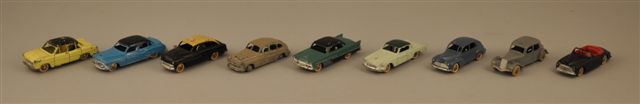 DINKY TOYS France. 1/43ème. LOT 9 unités comprenant : une Peugeot 203. Une Simca 8 sport. Une Citroën 11BL. Une Plymouth belvédère. Un taxi Ford Vedette. Une Ford Vedette (manque les pneus, peinture très abimée). Une Studebaker Commander. Une Buick Roadmaster. Une Simca Versailles. (sans boîtes)