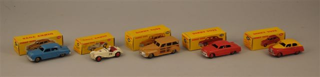 DINKY TOYS England. LOT 5 unités comprenant : une voiture Studebaker Land Cruiser, dans sa boîte. Voiture Estate Car, dans sa boîte. Voiture Austin Somerset Saloon, dans sa boîte. Voiture Ford Fordor Sedan, dans sa boîte en l'état. Voiture de sport M.G. Midget Sports, dans sa boîte en l'état.
