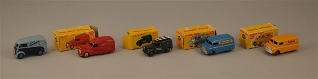 DINKY TOYS England. 1/43ème. LOT 5 unités comprenant : un camion publicitaire Bedford 10 cwt Van "Ovaltine", dans sa boîte en l'état. Un camion publicitaire Bedford 10 cwt Van "Kodak", dans sa boîte en l'état. Une fourgonnette publicitaire Austin Van "Nestlé's", dans sa boîte en l'état. Une fourgonnette Telephone Service Van, dans sa boîte en l'état. Un camion publicitaire Morris 10 cwt Van "Have a Capstan" (sans boîte).