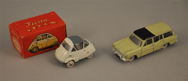 QUIRALU France. 1/43ème. LOT 2 unités comprenant : une voiture Isetta Velam. Dans sa boîte d'origine. Une voiture Simca Marly.