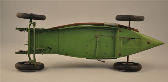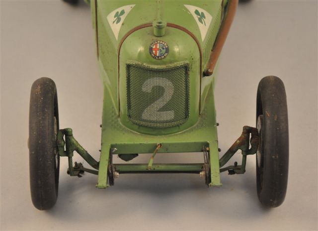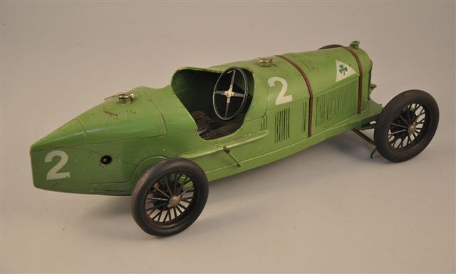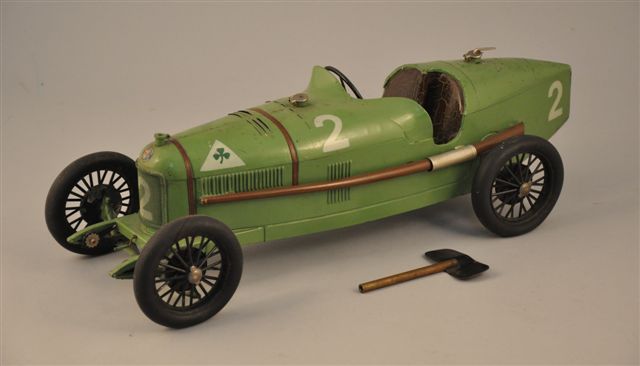 CIJ. ALFA ROMEO P2, voiture de course en tôle laqué vert, pneus pleins en caoutchouc, moteur mécanique avec sa clé de remontage. Dans sa boîte d'origine. Fabriquée entre 1931 et 1939. Haut. 16, Long. 54, Larg. 18 cm. (petits manques, manque le couvercle de la boîte)