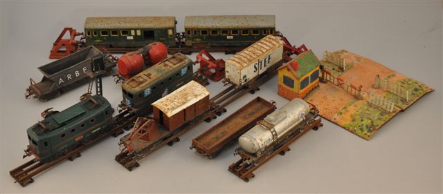 HORNBY. MECCANO. Echelle O. Ensemble comprenant deux locomotives type électrique BB-8051, deux wagons PLM, l'un avec compartiment bagages, un wagon double foudre "Bordeaux", wagon citerne AZUR, wagon ARBEL, wagon avec grue, wagon réfrigéré STEF, wagon plat, feux de signalisation, trois butoirs, un passage à niveaux en tôle polychrome et lot de rails, droite et courbes. L'ensemble en l'état (oxydation et manques)