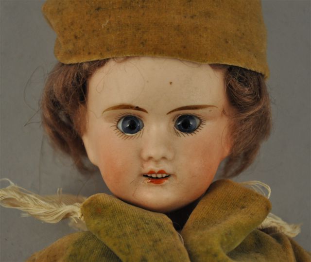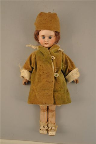 Petite française J V FRANCE. POUPEE, tête en biscuit moulé, yeux bleus fixes en verre, bouche ouverte avec dents, cheveux naturels, corps et membres articulés en bois peint. Vêtue d'un manteau et d'un chapeau en velours vert clair. Haut. 33,5 cm.