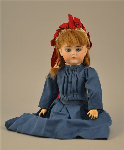 POUPÉE, tête en biscuit moulé pressé, yeux bleus mobiles en verre, bouche ouverte avec dents, marquée Made in Germany E 9, cheveux naturels, corps et membres articulés en composition. Vêtue d'un haut de corsage et d'une jupe en tissu bleu, d'un chapeau en toile de coton blanc et ruban rouge. Haut. 41 cm. (accident à un doigt)