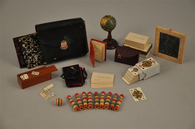ACCESSOIRES de poupée comprenant jeux de cartes, de dominos, et de quilles, un cartable d'écolière avec ardoise, cahier de musique, deux carnets à dessin et livre d'histoire, un globe terrestre pied en bois tourné, un portefeuille et ensemble de cartes de visite au nom de "Norah de Sibert". (usures)