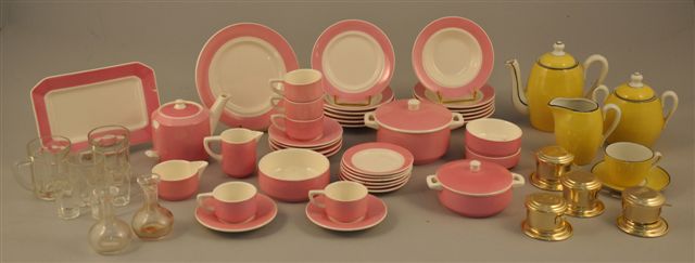 SERVICE de table de 34 pièces en faïence rose et blanc comprenant six assiettes à potage, six assiettes, six assiettes à dessert, deux légumiers couverts, une théière, cinq tasses, six sous-tasses, un pot à crème, un pot à lait. (manche de la théière accidentée)