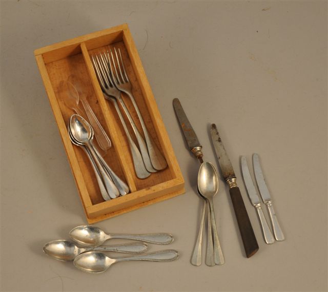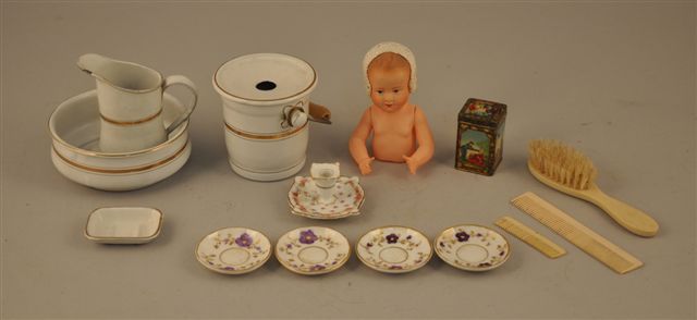 LOT comprenant un service de toilette en tôle émaillée : vasque, broc, porte savon et pot de chambre. Deux peignes et une brosse, une boîte à thé, un bougeoir porcelaine, une suite de quatre sous-tasses en porcelaine peinte, lot de couverts de dinette dans un range couvert en bois, et divers.