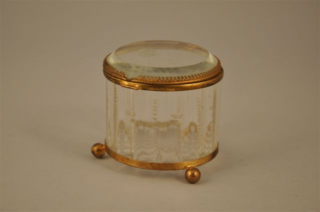 LOT comprenant une BOÎTE à BIJOUX circulaire en cristal taillé à larges côtes, gravé de points, monture en métal doré reposant sur trois pieds boules. Fin XIXème. Haut. 6,5, Diam. 7 cm. (petits accidents à la monture)