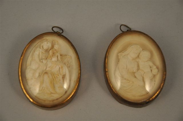 Deux MEDAILLONS en plâtre représentant des scènes de la vie du Christ, cadres en laiton. Fin XIXème. 5,5 x 4 cm (égrenures et tâches)
