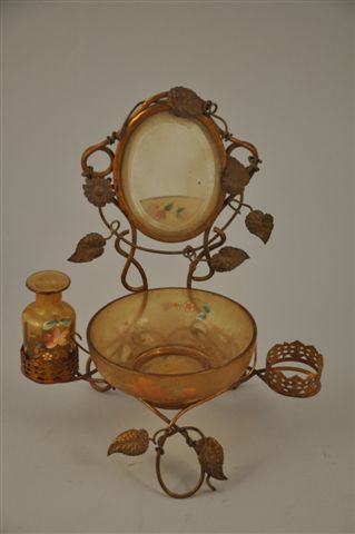 LOT comprenant : BAGUIER. Le réceptacle et le flacon en verre émaillé de fleurs, la monture en laiton à décor de feuilles de pampres, un miroir dans la partie supérieure. Haut. 22,5 Larg. 20, Prof. 13 cm. (manque un flacon, petits accidents)