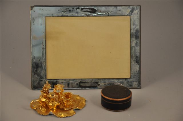 LOT de BIBELOTS comprenant une boîte ronde, deux porte-photos dont un en métal doré de style Louis XVI, deux petits miroirs, cinq vignettes aquarellées représentant les jeux de l'Amour et de l'Hymen (trois encadrées), un service à thé-café miniature en porcelaine dorée (accidents).