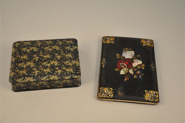 LOT comprenant une COUVERTURE de cahier en laque européen à décor sur le plat supérieur d'une composition de fleurs peintes et burgautées, motifs peints à l'or et burgautés au angles, perles de nacre, 23 x 15 cm. (usures, manque une perle). BOITE en cartonnage laqué noir à décor plein imprimé de myosotis, couvercle à charnière. Haut. 4, Long. 18, Larg. 15 cm.
