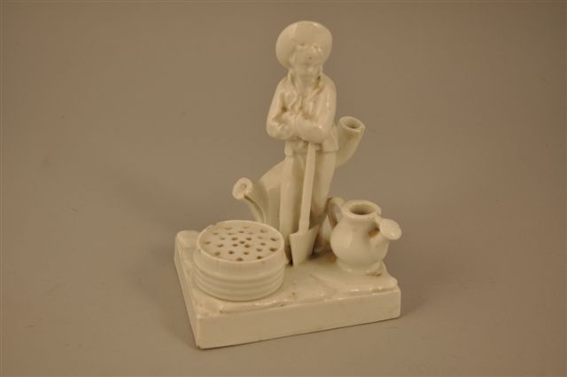 ENCRIER "LE JARDINIER" en porcelaine. Jardinier en pied tenant sa pelle, sur terrasse rectangulaire. Fin XIXème. Haut. 15, Long. 11, Larg. 8,5 cm (égrenure).