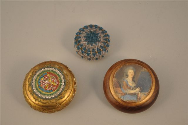 LOT comprenant DEUX BOITES rondes. La première en laiton doré, le corps à motifs en relief de guirlandes, le couvercle à charnière à décor en mosaïque de verre polychrome formant mille-fleurs. Diam 7,5 cm. La seconde en corne blonde, habillée d'une résille de perles de verre blanches et turquoises en motif rayonnant. Diam. 5 cm (petit accident à l'habillage)