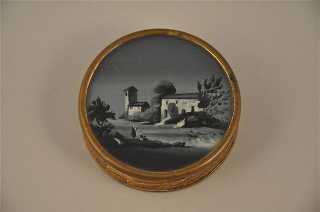 BOÎTE à couvercle en fixé sous-verre à scène lacustre peinte, le pourtour décoré de frises de rinceaux. diam. 7 cm. (accidents, tâches et manque)