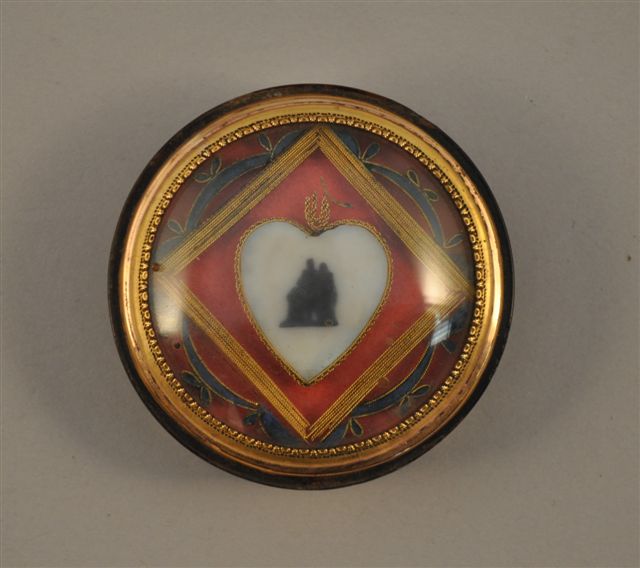 BOÎTE circulaire en écailles à couvercle cerclé d'un jonc doré, dans un croisillon doré avec entrelacs bleuis, un camée en forme de coeur avec couple. XIXème. Long. 6.5 cm.