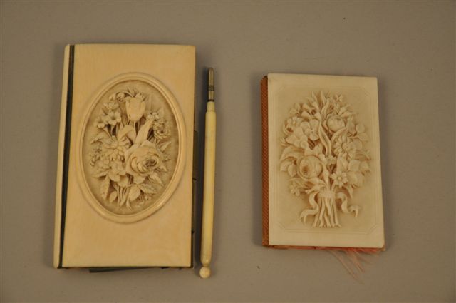 LOT de deux CARNETS DE BAL en ivoire, le premier à décor sculpté de fleurs au naturel dans une réserve circulaire, avec un porte-plume en ivoire, le second à décor sculpté de fleurs enrubannées. Seconde moitié du XIXème. 11,5 x 6,5 et 9 x 5,5 cm