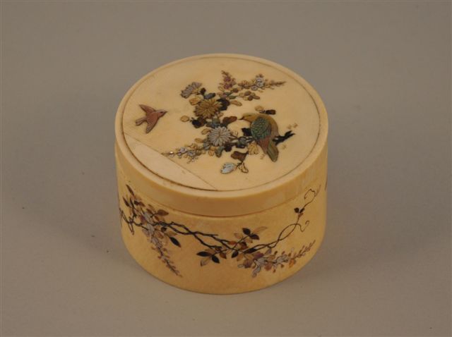 BOÎTE RONDE en ivoire et incrustations de nacre et d'écaille de tortue. Décor tournant d'oiseaux, chrysanthèmes, de glycines et papillons. A l'intérieur, décor de papillons en nacre. Porte au revers une signature dans un cachet ovale en nacre.