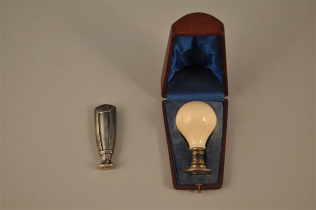 LOT de DEUX CACHETS comprenant : un CACHET le pommeau de forme boule en ivoire, le cachet en argent , dans son écrin. Long. 7 cm. Un CACHET en argent décor Art Déco, Long. 6 cm, Poids : 25 g.