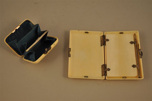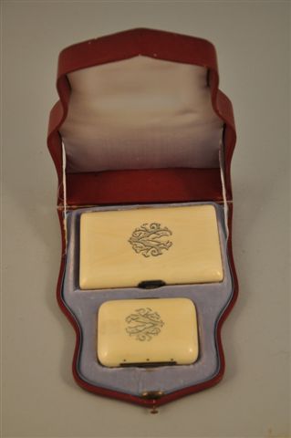 ÉCRIN en cuir bordeau renfermant un CARNET et un PORTE-MONNAIE en ivoire, monogrammés "V.M.".