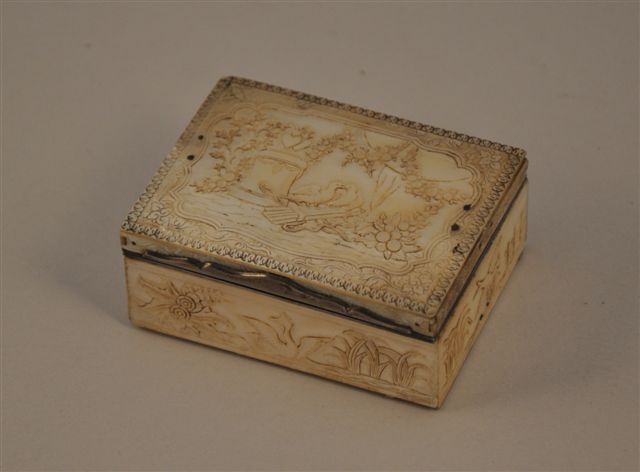 BOÎTE rectangulaire en nacre, couvercle à charnière. Décor en bas relief et finement gravé, sur le couvercle, dans un cartouche mouvementé, d'un couple d'oiseaux sur un carquois de flèches, symbolisant le serment d'amour. Le corps gravé toutes faces d'oiseaux dans un paysage lacustre. Monture en argent. Début XIXème.