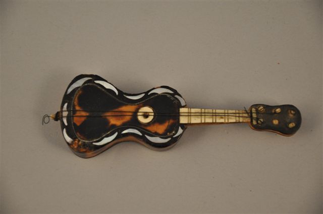 GUITARE miniature en placage d'écaille et ivoire, la table supérieure incrustée de nacre, six clés. XIXème. Haut. 11 cm (accidents et manques)
