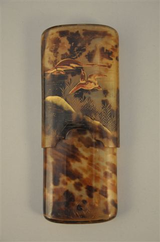 ÉTUI en écaille. Deux parties coulissantes. La partie supérieure, échancrée, à décor en laque or et rouge, sur les deux faces et en relief, d'oiseaux sur fond de paysage. JAPON. XIXème. Dim. pour chaque élément : Haut. 10,5, Larg. 6,6, Prof. 2,5 cm.